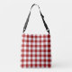 Stylish all-over-print tote bag features a classic red and white gingham pattern and an adjustable black strap. Dark red, white, and light red squares form a bold, buffalo plaid.