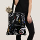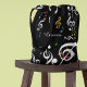 A personalised music themed design with treble clefs and some other colour musical symbols on black