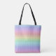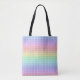 Overlapping ribbons run the spectrum and are held together by evenly-spaced "stitches" made in a matching colors of yarn. This wonderful design is computer-generated and pays homage to all those with a penchant for needle-craft . . . whether sewing, cross-stitch, embroidery or crewel . . . this lovely tote is an excellent choice for your favorite yarn crafter.