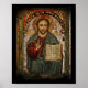 Vintage Eastern Orthodox panel painting. Christ raising his right hand in blessing while his left hand holds the bible.