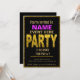 All purpose generic party invitation. This invitation features gold lettering with a bold "PARTY" in glitter with a glitter border. Note: This is a graphic art print design by Amelia Carrie and contains no messy glitter.