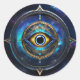 Protect your self and your valuables from bad actors with this all seeing Evil Eye symbol. Yellow eyeball with a blue iris and a very wide pupil set into a mystical amulet and backed by the vastness of the heavens.