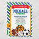 Celebrate your Birthday with our All Star Sport Party Invitation. Design features basketball, baseball, rugby, american football and soccer balls on top of dark blue, orange and green stripes. This all star sport invitations is perfect for your sport themed birthday party, sport first birthday party or sport events invitations.