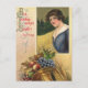A vintage illustration Thanksgiving postcard featuring a woman and a cornucopia of fruit with the text "All Thanksgiving Bounty Be Thine."