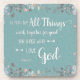 Plastic coaster with distressed white typography on textured aqua background surrounded by watercolor flowers, with well known verse from Romans 8:28, “… All things work together for good for those who love God…”
