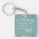 Acrylic key tag with distressed white typography on textured aqua background surrounded by watercolor flowers, with well known verse from Romans 8:28, “… All things work together for good for those who love God…”