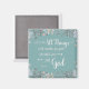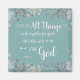 Magnet with distressed white typography on textured aqua background surrounded by watercolor flowers, with well known verse from Romans 8:28, “… All things work together for good for those who love God…”