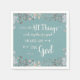 Napkins with distressed white typography on textured aqua background surrounded by watercolor flowers, with well known verse from Romans 8:28, “… All things work together for good for those who love God…”