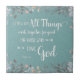 Ceramic tile with distressed white typography on textured aqua background surrounded by watercolor flowers, with well known verse from Romans 8:28, “… All things work together for good for those who love God…”