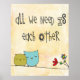 cute drawing of two owls sitting on a branch with the words 'all we need is each other"