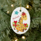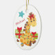 On the front of this keepsake ornament for a child is an adorable giraffe that is wrapped in a string of Christmas lights. Beside him are brightly wrapped Holiday packages. Your child's name is in red just below a blue star. The back has another image of the giraffe along with a Merry Christmas message and more stars. Cute!