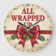 This festive clock features the bold, red text "ALL WRAPPED UP" on a vintage, aged parchment background studded with gold nail heads or rivets. The lower half of the clock is dominated by a large, sumptuous red velvet ribbon tied in a bow, accented with holly and red berries. A red ribbon border runs horizontally across the center. The design may look real due to the high detail and three-dimensional texture in the artwork.