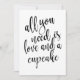An elegant cutting edge wedding sign, features the text "All you need is love and a cupcake" in a extroverted script font, the brush texture adds a spontaneous and playful feeling. The background colour can personalised according to your needs and preferences, please contact me if you have any special request.
