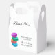 All you need is love and a macarons custom wedding Favour Boxes. Cute wrapper design with custom slogan and logo. Personalised with names of bride and groom plus your unique tagline. Handy for giving away delicious French macarons, tasty pastry, cookies and other baked treats. White or custom colour box. Text and colours can be changed to match your theme. Font style can be changed too. Pretty drawing of colourful macarons stack. Pink green orange and blue colours. Elegant treat box for guests.