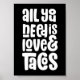 This design features the phrase "All you need is love & tacos" in a bold, playful font. The text has a fun and casual style that adds a touch of humour and positivity, making it perfect for taco lovers and those who appreciate a light-hearted message.