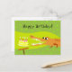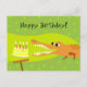 Alligator is smiling at his birthday cake with four candles. Text says Happy Birthday, but is customisable.