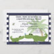 Featuring a playful baby alligator/crocodile and his loving mummy admiring a little bird/birdie. Features: shades of GREEN and striped navy BLUE colour theme. This MonkeyHutDesigns baby shower invitation coordinates with some of today's popular baby crib bedding set(s). Great theme for a boy!