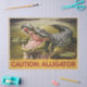 A vintage-inspired illustration featuring an alligator caution sign. This artwork blends classic wildlife illustration with a retro aesthetic, reminiscent of old warning signs or nature guidebooks. The design may include an elegantly detailed alligator with distressed textures, bold lettering, and earthy tones, evoking a timeless, adventurous feel.