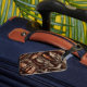 Close-up of intricately carved alligator heads and tails on a leather surface, featuring a belt buckle and detailed floral patterns.