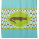 Shower curtain with a chevron striped background of green, white, blue, and brown with turquoise blue wide borders on top and bottom and a brown polka dotted alligator on a green banner in the middle.