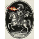 A lion-headed warrior rides forth on a horned steed, breathing fire and wielding a spiked weapon. A commanding figure of mythic authority, embodying battle, spectacle, and supernatural force.