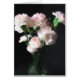 Beautiful white carnation flowers with pink edges on a black background.