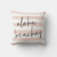Blush pink striped outdoor pillow practically screams summer with "aloha beaches" overlaid in off-black handwritten lettering. A perfect addition to your pool area, backyard or beach house.