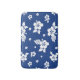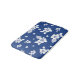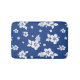 Bath mat shows a seamless classic Hawaiian Aloha hibiscus flower pattern. The flowers are white, and the background is blue.