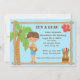 Start your celebration off right with this adorable Luau invitation. Whether it's a backyard barbecue or a kids birthday party this is the perfect invite for you! It has a teak wood frame with a palm tree in the left corner. There's this adorable boy holding a guitar standing next to the tree. He's wearing blue shorts and has brown hair. In the top right corner there is a red hibiscus flower. Check out the many other designs and products in this line. ©JW Illustrations