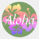 Green background, rainbow hibiscus flowers and "Aloha" text in white modern font is the perfect greeting!