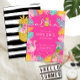 Tropical Hawaiian Luau Birthday Invitation with Hot Pink Tropical Leaves, Flamingo and Pineapple with black and white stripe watercolor background.