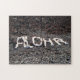 The word Aloha written in while coral rocks onto the black lava rocks.