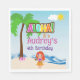 Tropical beach Luau birthday personalised paper napkins, with cute hula girl, palm tree and beach scene, with easy to customise text.