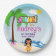 Tropical beach Luau birthday party paper plates, with cute hula girl, palm tree and beach scene, with easy to customise text. Complete your summer theme party with this customised sign, great for kids or adults.