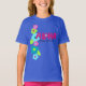Cartoon flowers help send the message that aloha means hello! This design is available in another colorway as well. This original cartoon adorns these gals t-shirts on the front with a companion print of a cluster of flowers on the back. These designs come in several colorways.