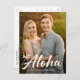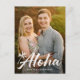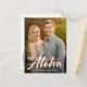 Modern, tropical holiday postcard displaying your full-bleed vertical photo on the front with "Aloha" in a white hand-lettered script complimented by a hand-drawn palm tree. Personalize the front of the Aloha holiday postcard by adding your name. The postcard reverses to feature your return address, additional photo, and custom message. Designed to coordinate with our Aloha Palm Tree holiday collection.
