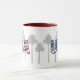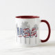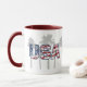 A vintage Hawaiian aloha shirt print in combined with an American flag to create this graphic which is framed by palm trees. Customise this design on your favourite mug.