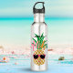 Stay cool and hydrated with this tropical personalised water bottle featuring a happy pineapple wearing sunglasses and a Hawaiian "Aloha" greeting in summer colours (pink, coral, orange, turquoise). Perfect for a day at the beach, work, back to school, gym and travel. Art by KL Stock.