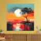 This atmospheric artwork captures a quiet moment of solitude beneath a glowing sunset. A lone figure stands by the water’s edge beside a windswept tree, silhouetted against a vast sky painted in warm shades of burnt orange, coral red, and soft gold. The oversized sun hangs low on the horizon, its light reflected across the still surface of the lake, creating a dreamlike mirror of colour and emotion.
