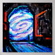 A lonely glowing figure standing by a window with a spiral galaxy outside. Original is here: https://www.dailypaintworks.com/fineart/alexandra-cook/alone-with-the-shiny-abyss-/855672