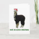 A black & white alpaca wears a Santa hat with the text, "Have an alpaca Christmas"