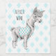 Whimsical drawing of an alpaca wearing boots and a vest with a turquoise diamond pattern against a pale turquoise diamond pattern background. A lovely illustration for animal lovers and those who love a warm, fuzzy feeling!