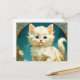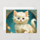 Postcard featuring a white cat in the Art Nouveau style of Alphonse Mucha! A fluffy white cat stares wide eyed at the viewer against a blue backdrop. A great gift for cat lovers and Art Nouveau collectors!
