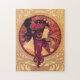 Alphonse Mucha Donna Orechini puzzle. Lithograph advertisement. Alphonse Mucha was a master of Art Nouveau advertisements and commercial posters. Donna Orechini is a striking profile portrait of a woman wearing a heavily jewelled headdress with dark rubies and gold crescents. The woman’s hair is dark brown and her eyes are likewise dark. She is surrounded by the heavy ornamentation typical of Mucha’s work. A beautiful gift for fans of Art Nouveau posters, Alphonse Mucha, and vintage prints.