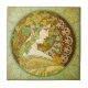 Alphonse Mucha Laurel tile. Lithograph poster from 1901. Czech artist Alphonse Mucha was renowned for his allegorical works. Laurel is a painting featuring a beautiful young brunette draped in ivy. She looks onward in profile and wears a yellow rose on her chest. The poster is intricately ornamented with interlocking ivy leaves, tiles and arrows. A great gift for fans of Mucha, art nouveau posters, and vintage prints.