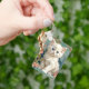 Keychain featuring a white cat in the style of Alphonse Mucha! This blue eyed fluffy kitten poses with pink flowers and blue blankets. A fabulous gift for cat lovers and Art Nouveau collectors!