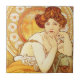 Alphonse Mucha Topaz tile. Oil painting on canvas. Czech artist Alphonse Mucha frequently painted allegories, and Topaz is from a series depicting gemstones as beautiful women. The painting features a young beautiful young woman wearing a deep topaz dress standing in from of an ornate jewelled background. A great gift for fans of Mucha, Art Nouveau, and vintage prints.