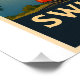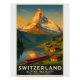 Travel poster design titled “Alpine Majesty – Matterhorn Sunrise”. The majestic Matterhorn mountain rises sharply, its snow-covered peak glowing in the first light of sunrise. Warm orange and golden rays illuminate the top of the mountain, blending into a clear blue sky with soft morning clouds. Below, a calm alpine lake reflects the mountain perfectly