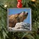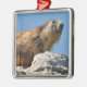 Closeup Alpine marmot (Marmota marmota) on rock on blue sky background, in the French Alps, Savoie department at La Plagne