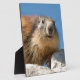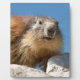 Closeup Alpine marmot (Marmota marmota) on rock on blue sky background, in the French Alps, Savoie department at La Plagne